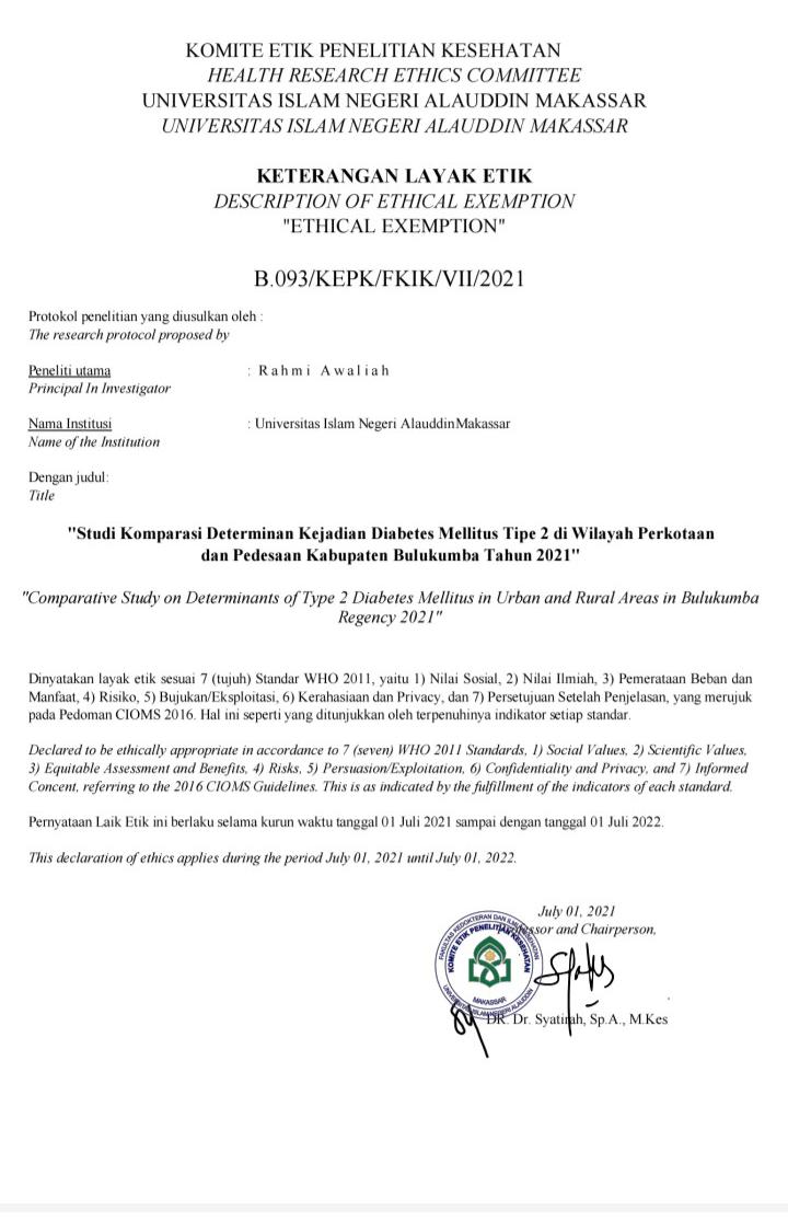 Diabetes mellitus type 2 is one of the degenerative diseases whose mortality and morbidity rates continue to increase, both in urban and rural areas. Bulukumba Regency is one of the areas with the highest prevalence of type 2 diabetes mellitus. This study aimed to determine the differences in the determinants of the incidence of type 2 diabetes mellitus in urban and rural areas of the Bulukumba Regency in 2021. The type of research used is quantitative with an observational analytic approach and a cross-sectional study design. The population in this study were all people with type 2 diabetes mellitus in urban and rural areas of the Bulukumba Regency. The sample of this study amounted to 210 respondents consisting of 140 respondents in urban areas and 70 respondents in rural areas who were taken using purposive sampling technique with inclusion criteria, namely patients who do not have comorbidities or complications such as coronary heart disease, stroke, and kidney failure as well as patients who are not pregnant at the time of this study. Data were analyzed using the chi-square test. The results of this study indicate that there are differences in consumption of sugar-sweetened beverages (p = 0.032), consumption of fast food (p = 0.044), physical activity (p =0.001), and economic status (p=0.04) of people with type 2 diabetes mellitus in urban and rural areas. Meanwhile, there was no difference in smoking behavior (p=0.404) with type 2 diabetes mellitus in urban and rural areas of the Bulukumba Regency. Management of type 2 diabetes mellitus is important as early as possible so that the morbidity rate due to diabetes can be reduced in the future. The different risk factors between urban and rural areas should be taken into account.
